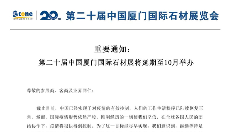 廈門國際石材展宣布再次延期,延至10月27-30日舉行!